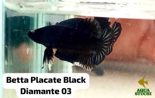 Fisicamente, o Betta Macho Black Diamante Plakat apresenta corpo compacto e musculoso, com nadadeiras curtas típicas do tipo Plakat. Essa característica proporciona maior mobilidade, resistência e menor risco de danos, sendo ideal para quem busca um Betta mais ativo e durável.