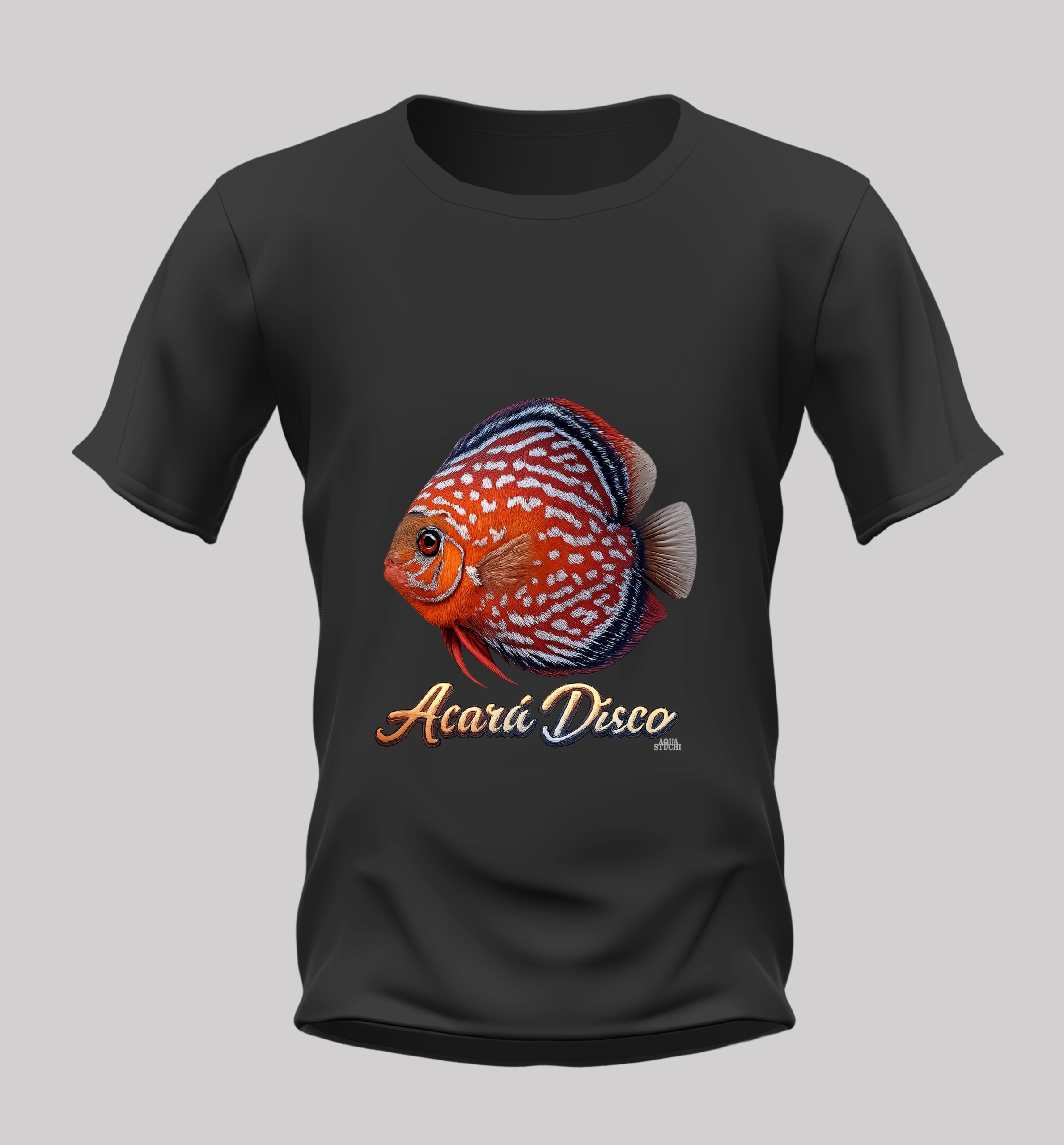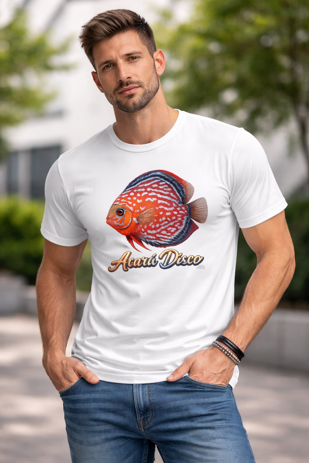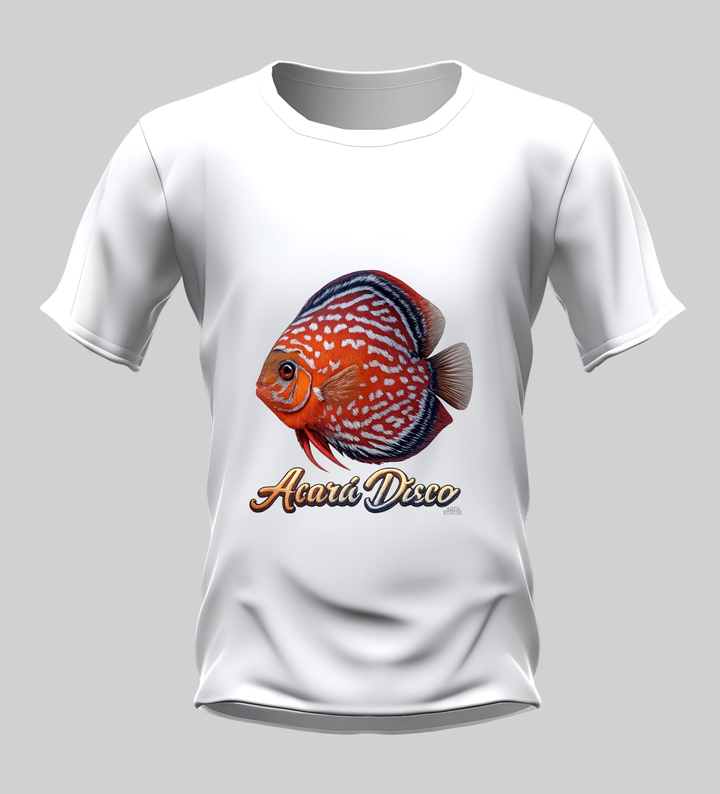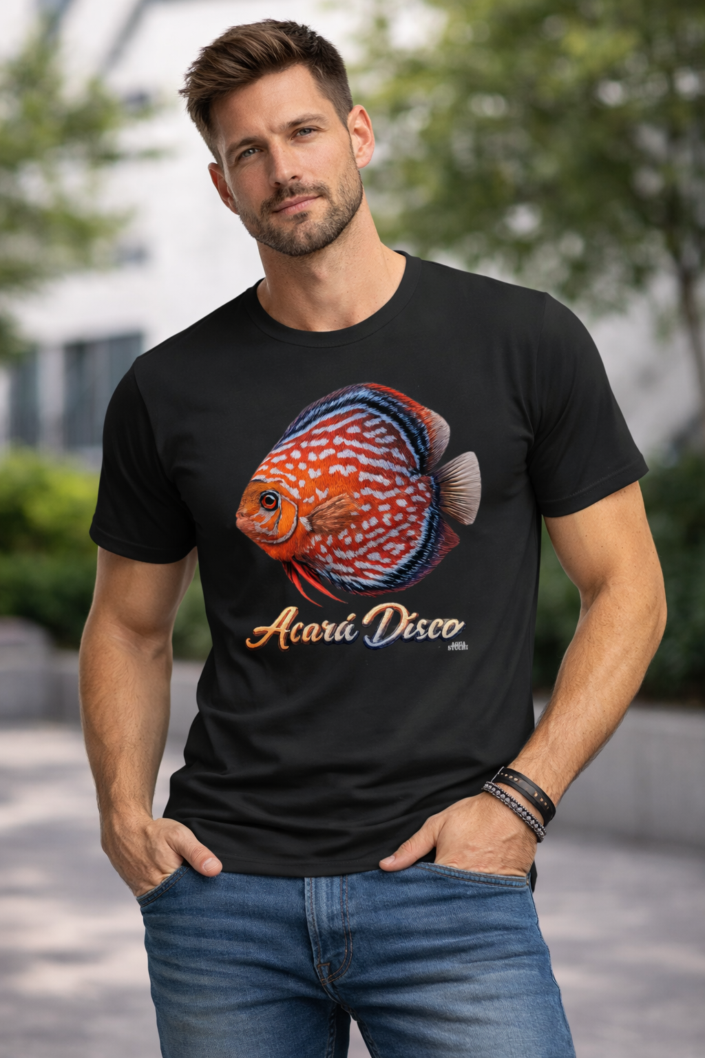 Camiseta masculina premium em 100% algodão fio 30, com estampa exclusiva do Acará Disco, um dos peixes ornamentais mais admirados do aquarismo mundial.