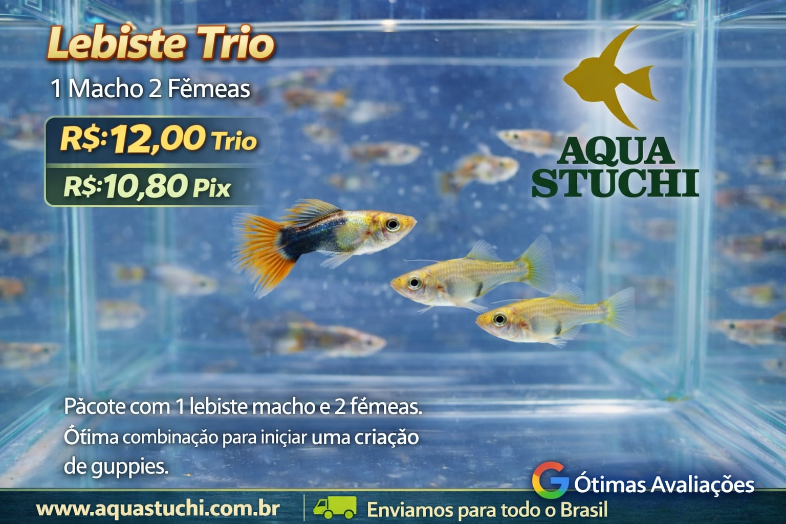 O Lebiste Trio, composto por 1 macho e 2 fêmeas de Poecilia reticulata, é a escolha ideal para quem deseja iniciar ou manter um aquário de guppys com equilíbrio, reprodução saudável e menos estresse para as fêmeas.