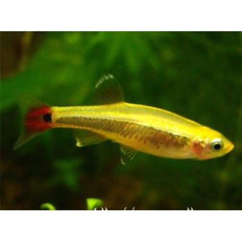 Corpo alongado com linha lateral branca iridescente com uma linha negra na parte inferior; restante do corpo translúcido com manchas vermelhas na nadadeira caudal e dorsal de coloração vermelho. Focinho curto com mandíbula menor e um pouco projetada. Existem variedades domésticas de cor amarela (gold) e de longas nadadeiras (véu).